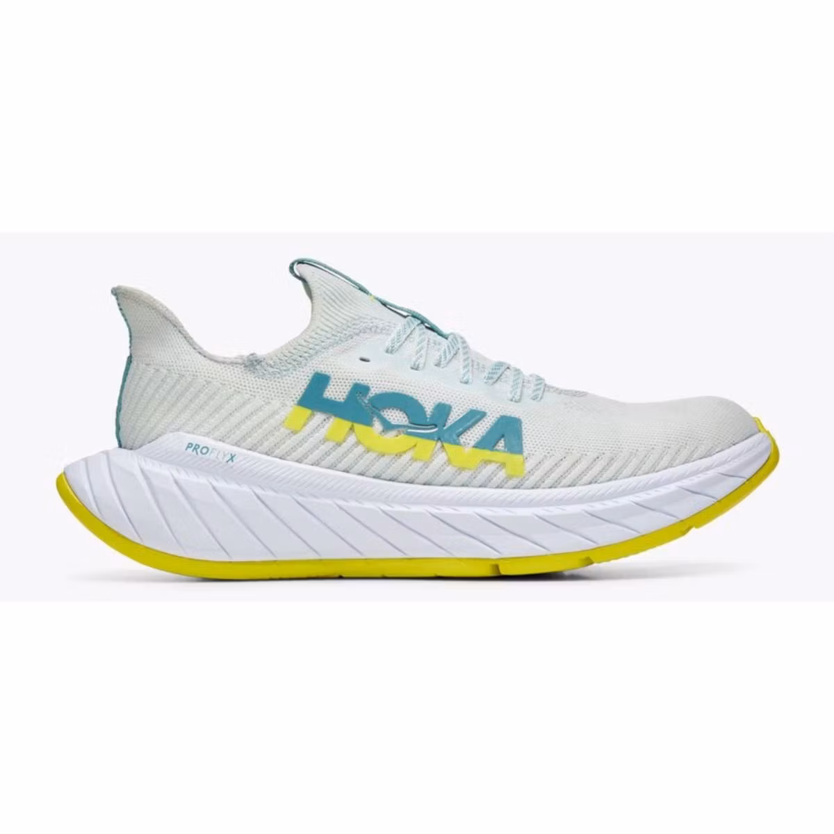 Hoka One One Carbon X3 är en löparsko designad för hög fart, med en kolplatta som ger extra framdrivning. En tydlig rockerform bidrar till att skjuta löparen framåt, medan kolplattan förbättrar både stabilitet och driv. Ovandelen har en ny konstruktion som ger en bättre passform och stödjer foten, samtidigt som den är ventilerande.